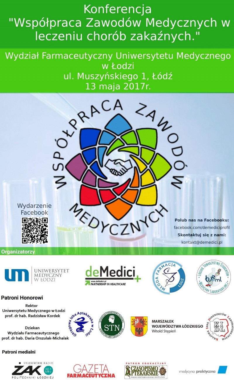 Fundacja deMedici, Młoda Farmacja Łódź oraz Łódzkie Towarzystwo Studentów Medycyny Laboratoryjnej zapraszają na konferencję "Współpraca Zawodów Medycznych w Leczeniu Chorób Zakaźnych".
