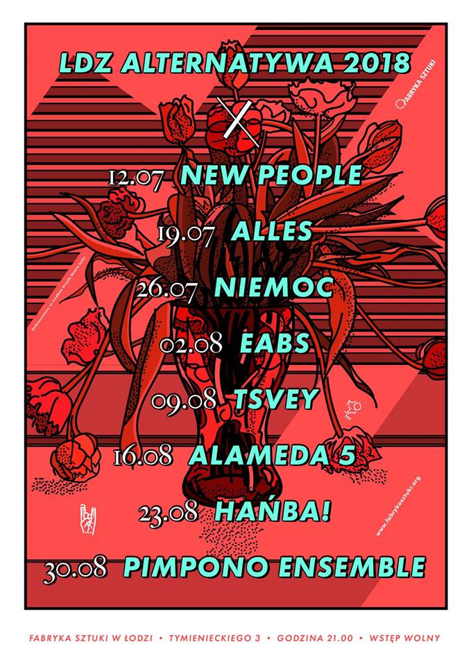 Sierpień otwiera Electro-Acoustic Beat Session, czyli polski septet jazzowy z Wrocławia, wyrosły w środowisku hip-hopowym, założony w 2011 r. przez Marka Pędziwiatra. Zadebiutowali w maju 2017 płytą Repetitions (Letters to Krzysztof Komeda). Nominowani do Fryderyka 2018 w kategorii Jazzowy Fonograficzny Debiut Roku. Tydzień później mocne muzyczne doznania zaproponuje TSVEY, łódzki duet, który tworzą Piotr Połoz i Bartek Kujawski. 16 sierpnia usłyszymy Alamedę 5, bydgosko-toruńską grupę grającą psychodeliczną muzykę avant rockową – jedyne w swoim rodzaju połączenie brzmień gitarowo-elektronicznych z transowymi rytmami. Przedostatni koncerty należy do formacji Hańba!, czyli krakowskich muzyków, którzy kontynuują swoją fikcyjną muzyczną opowieść, w której punk rock nie powstał w latach 70., lecz w burzliwych czasach II Rzeczpospolitej. Cykl zakończy Pimpono Ensemble, zespół z Kopenhagi składający się z młodych muzyków z Polski, Danii i Norwegii aktywnie działających na europejskiej scenie muzyki improwizowanej i alternatywnego jazzu. Koncerty LDZ Alternatywa 2017 odbywają się w czwartki na terenie Fabryki Sztuki. Wejście na teren przy Tymienieckiego 3 od godz. 20, początek koncertów o godz. 21.